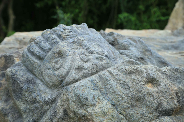 2015年,當(dāng)?shù)貙?duì)神農(nóng)部落旅游資源進(jìn)行調(diào)查時(shí),偶然發(fā)現(xiàn)了多處巖石上的凹穴。在桐柏山上竹林環(huán)繞的半山腰處,一塊巖石上赫然可見一處形似人面像的巖畫——“頭頂”約有10條線狀紋飾,組成“皇冠”的圖案;面部的圓環(huán)和圓點(diǎn),表示“雙眼”;下部5條射線狀紋飾,恰似“胡須”。這一長(zhǎng)20厘米、寬27厘米的人面像,是隨州發(fā)現(xiàn)的石器時(shí)期最為具象的巖畫,被當(dāng)?shù)厝朔Q為“太陽神”,也有人稱他為“炎帝神農(nóng)像”。