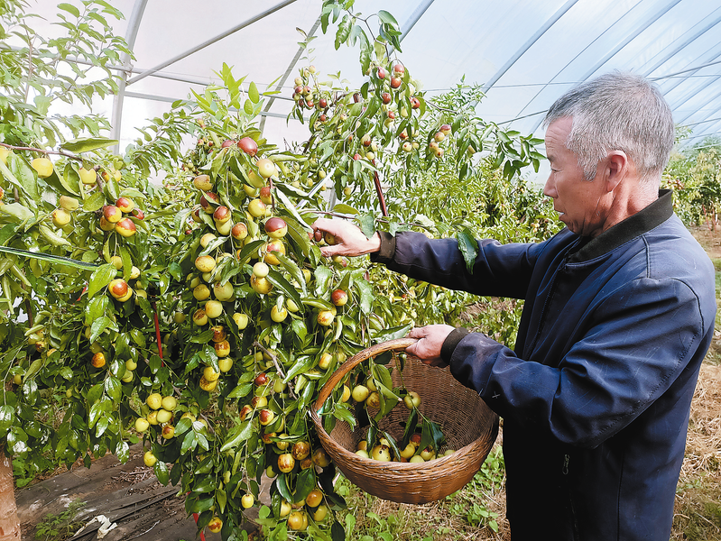 10月20日,丹鳳縣鐵峪鋪鎮(zhèn)化廟村群眾在采摘冬棗。據(jù)悉,該村從2021年發(fā)展大棚冬棗,目前有6座大棚冬棗已進(jìn)入產(chǎn)果期,預(yù)計(jì)今年可采收優(yōu)質(zhì)冬棗3000多公斤,帶動(dòng)村級(jí)集體經(jīng)濟(jì)收入6萬(wàn)元。 (本報(bào)通訊員 田 東 攝)