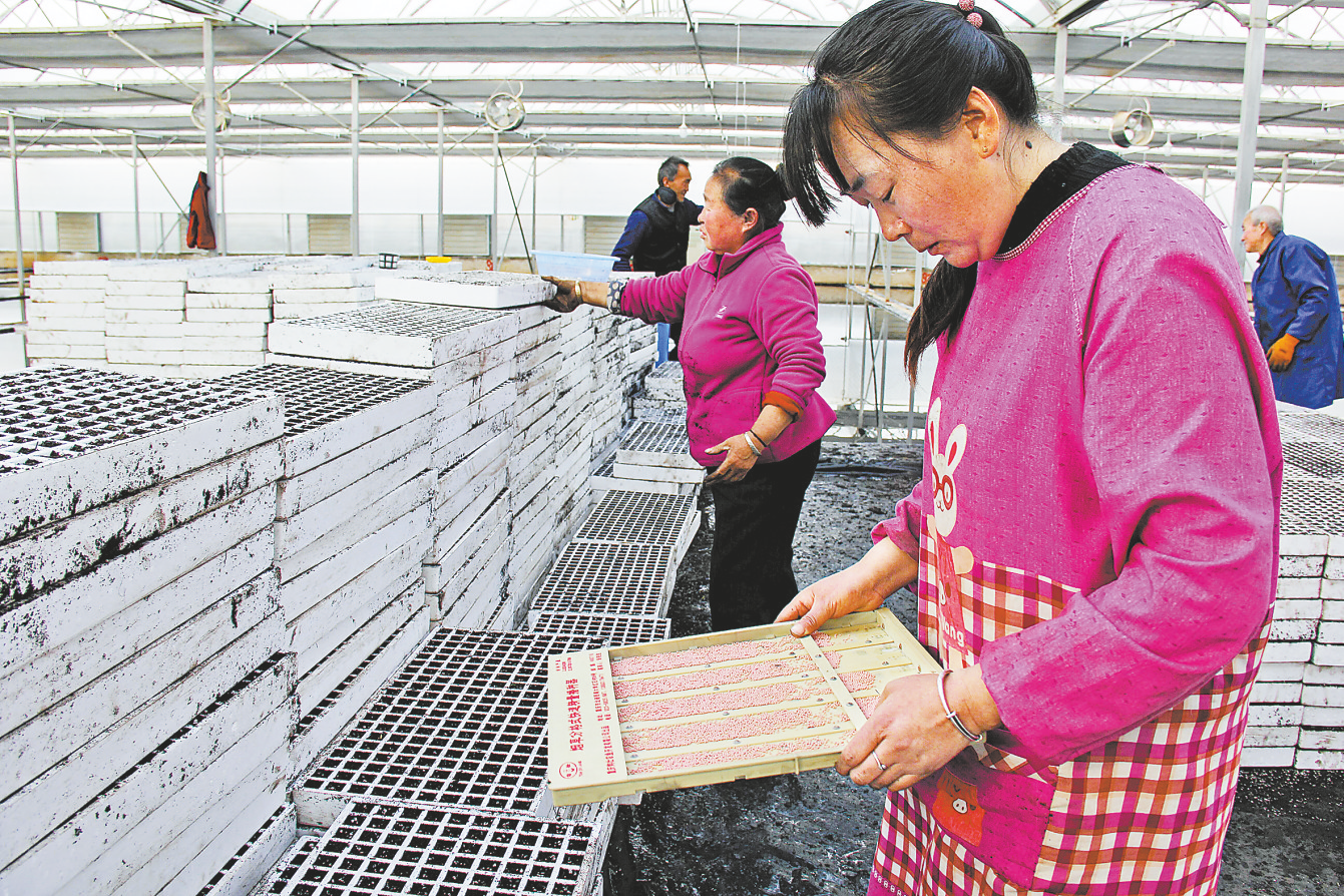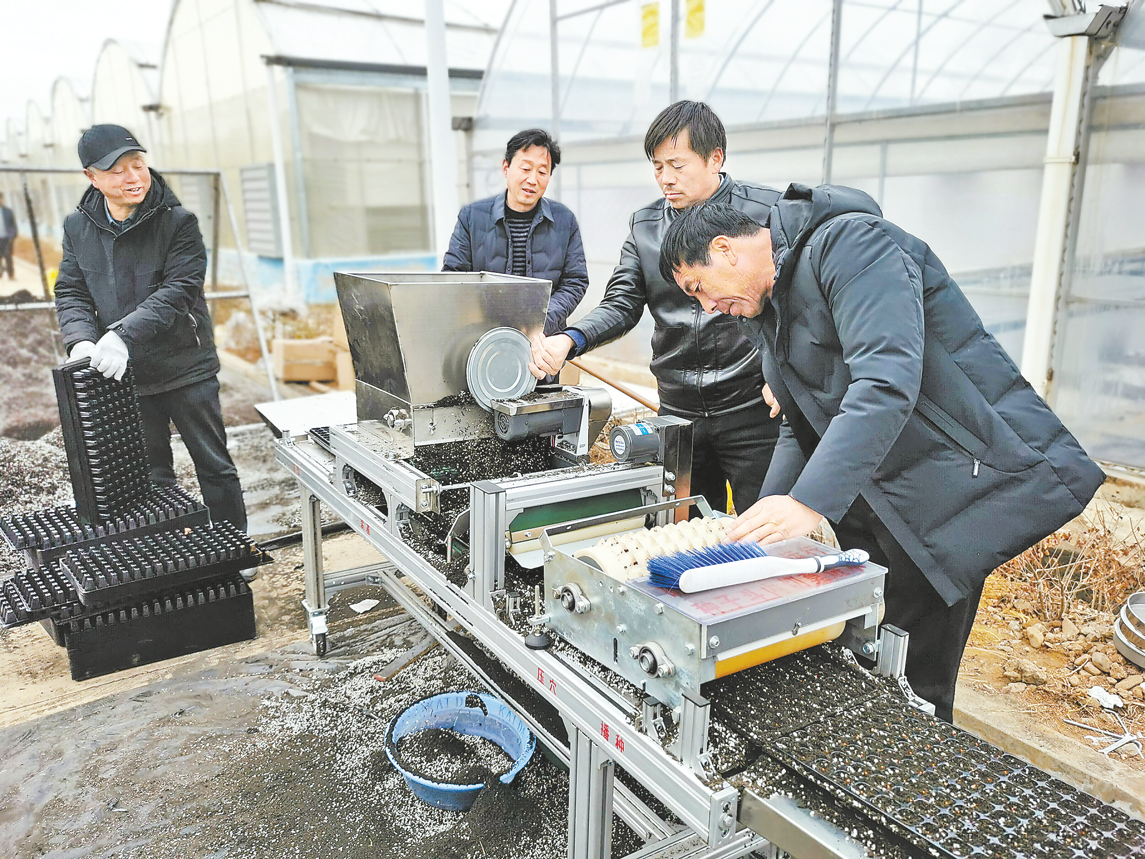 技術(shù)人員指導(dǎo)工人操作自動(dòng)點(diǎn)種機(jī)