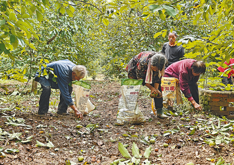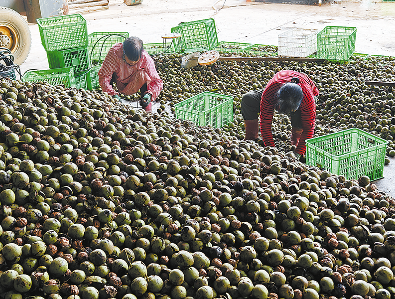 △剛剛從樹上打下來的鮮核桃,村民及時撿拾,收集后運(yùn)送至廠區(qū)。